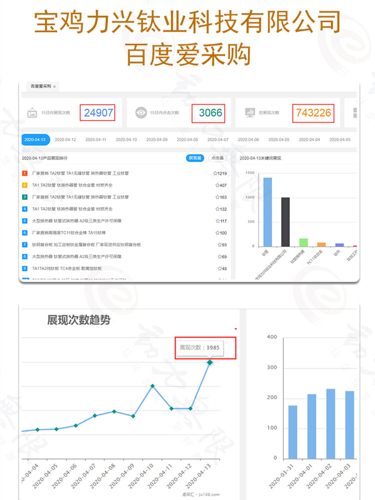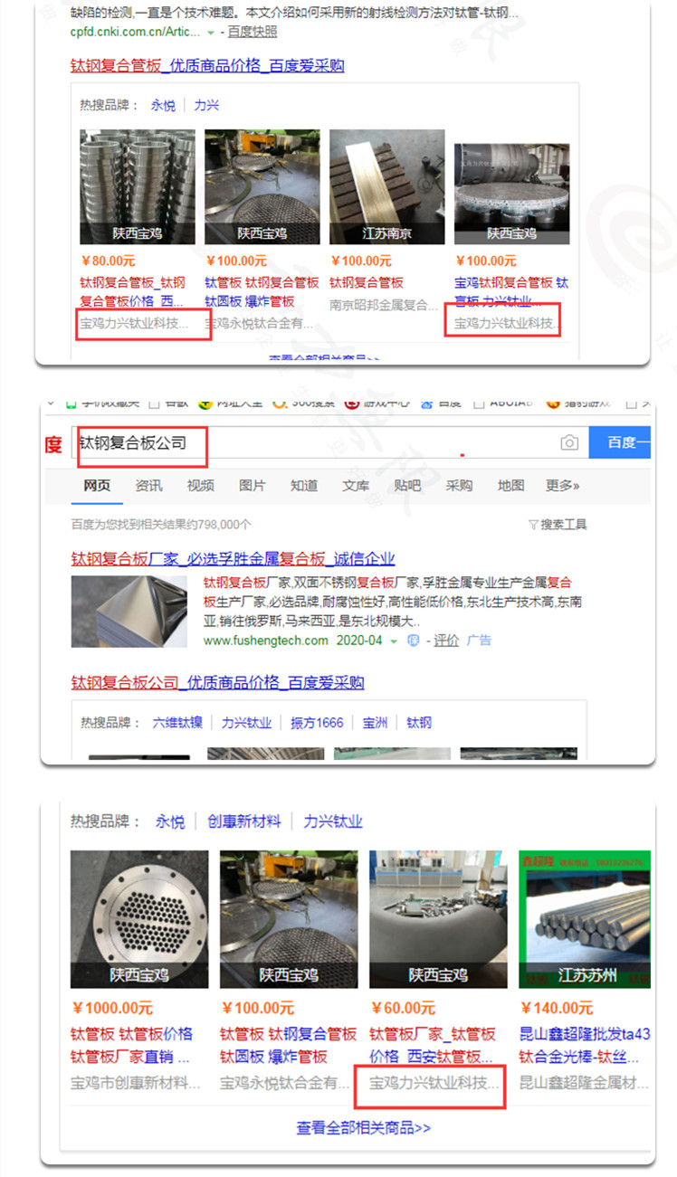 近15天內(nèi),曝光度為24907次,點(diǎn)擊數(shù)達(dá)到3066次;在關(guān)鍵詞搜索中,寶雞力興鈦業(yè)科技有限公司的“鈦合金梯子”、“TA2工業(yè)鈦板”、“鈦鋼復(fù)合管板”、“大型鈦換熱器”等,排在*位。