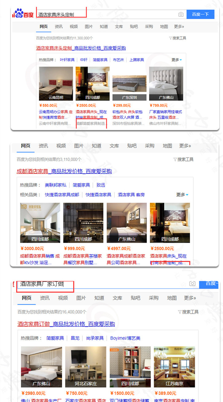 在關(guān)鍵詞搜索中,成都簡(jiǎn)愛(ài)家居制造有限公司的“酒店家居床頭定制”,排在第二位;“成都酒店家具”排在第四位。