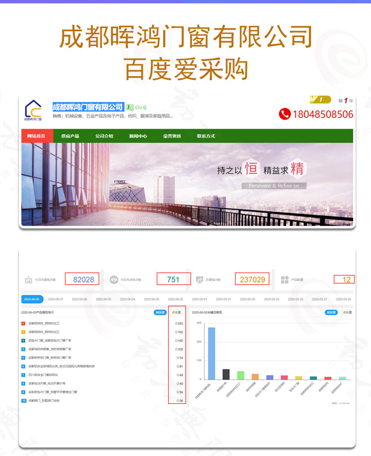 成都暉鴻門(mén)窗有限公司,這一個(gè)月以來(lái),百度愛(ài)采購(gòu)的總展現(xiàn)次數(shù)為237029次,近15天內(nèi),曝光度高達(dá)82028次,點(diǎn)擊數(shù)達(dá)到751次。