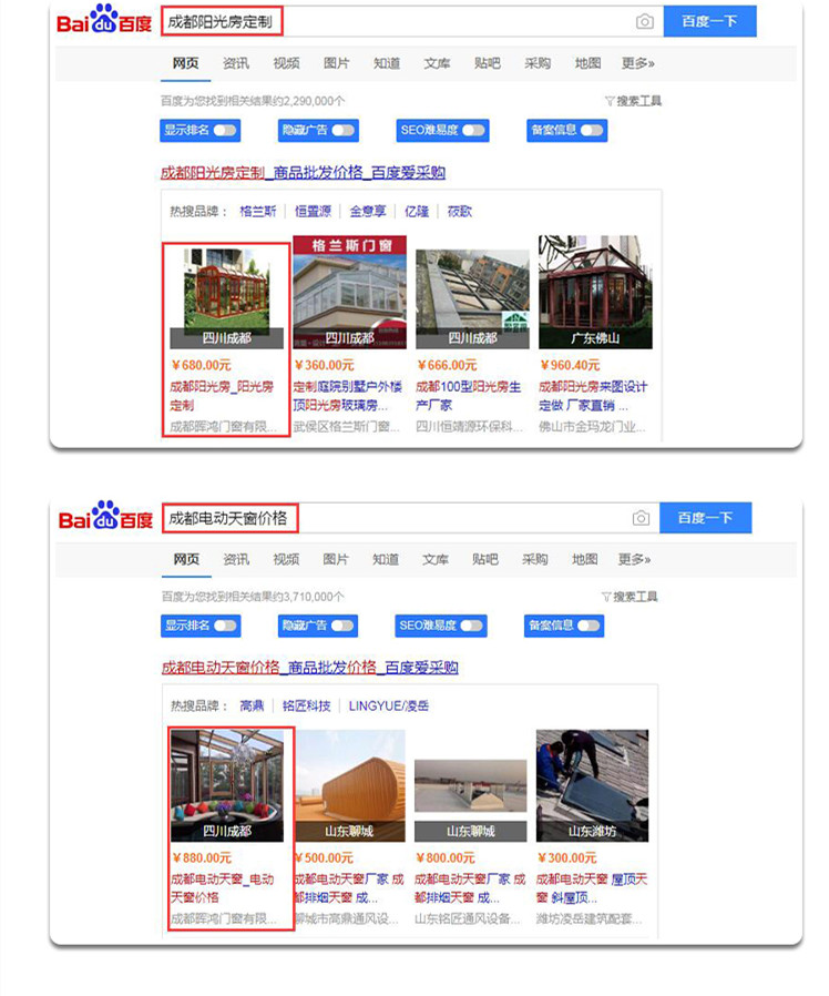 在關(guān)鍵詞搜索中,成都暉鴻門(mén)窗有限公司的“成都陽(yáng)光房定制”、“成都電動(dòng)天窗價(jià)格”,排在*位;“成都斷橋鋁門(mén)窗”排在第二位;“成都別墅銅門(mén)”、“成都鋁包木門(mén)窗排在第三名”。