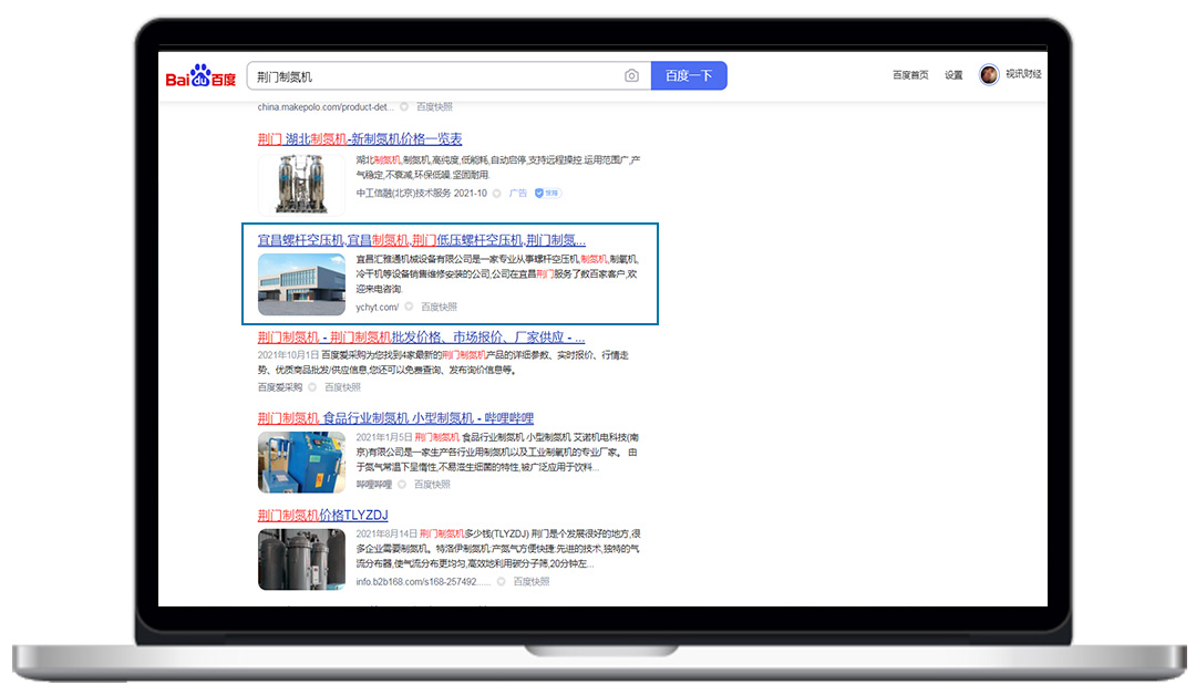 匯雅通官網(wǎng)上線不到1個月,成功被搜索引擎收錄,而且關鍵詞:荊門制氮機、宜昌螺桿空壓機、宜昌干燥機,均在百度首頁展示。