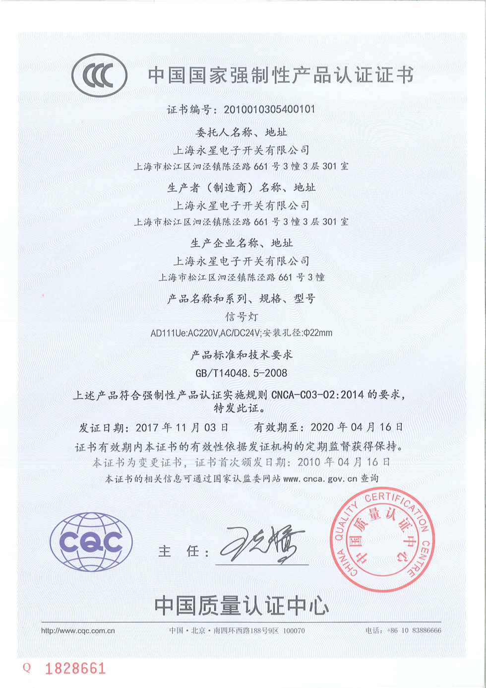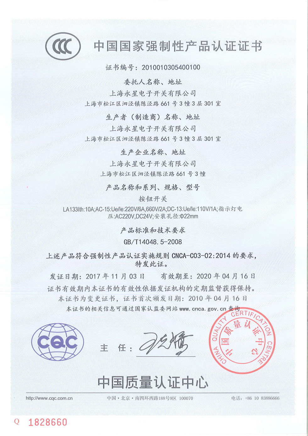 LA133按鈕開關(guān)CCC認(rèn)證證書