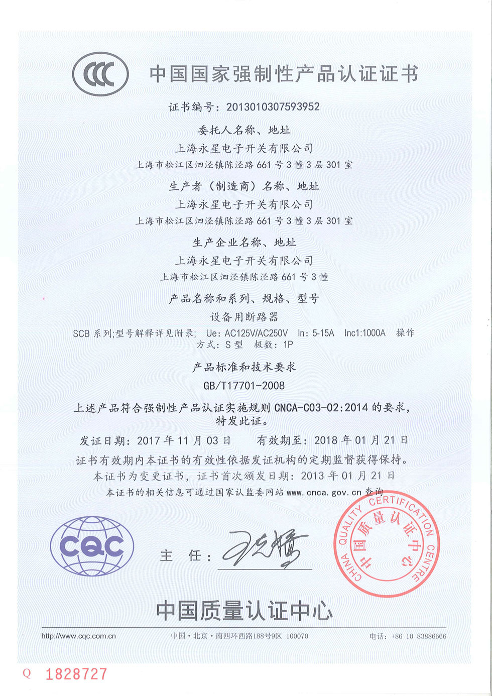 SCB過載保護開關(guān)CCC認(rèn)證證書