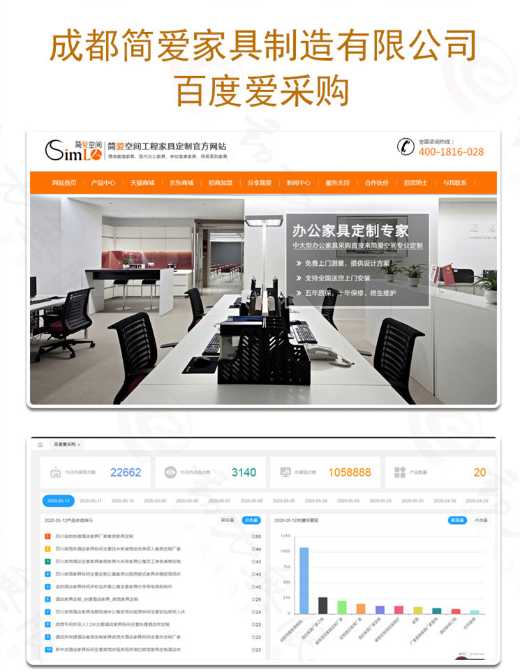 成都簡(jiǎn)愛(ài)家居制造有限公司,入駐百度愛(ài)采購(gòu)以來(lái),總展現(xiàn)次數(shù)高達(dá)105888,近15天內(nèi),展現(xiàn)次數(shù)為22662,點(diǎn)擊數(shù)達(dá)到3140次。