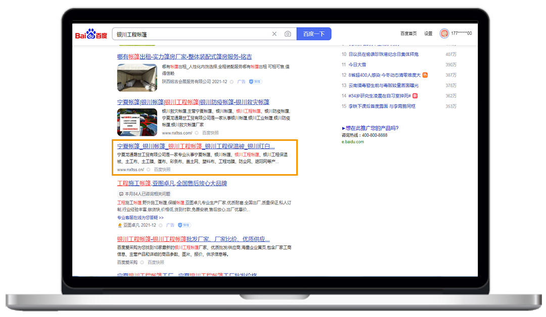 龍通晟世網(wǎng)站上線20天左右,就成功被搜索引擎收錄,而且關(guān)鍵詞:銀川工程帳篷、銀川工程保溫被、銀川紅白喜事帳篷等,均在百度首頁展示。
